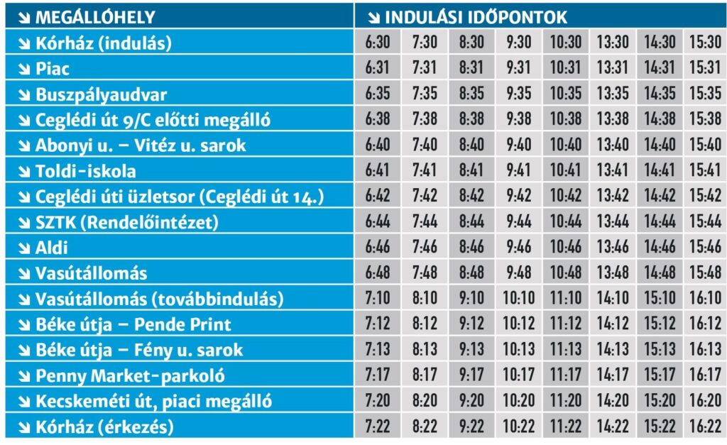 Hétfőtől-péntekig az alábbi időpontokban és útvonalon indul el a helyi buszos közlekedés. Hétvégén és ünnepnapokon a szolgáltatás szünetel. A teszt időszak alatt a szolgáltatás a lakosság számára ingyenesen vehető igénybe, a szolgáltatást az önkormányzat finanszírozza.